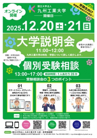 九州工業大学では、本学の進学を考えている受験生、保護者の皆さま、高等学校?予備校の教員の方々を対象に本学の教育?研究、入口、出口の現状を知っていただくことを目的とした「オンライン大学説明会?受験相談会」を開催いたします。?大学説明会では、九州工業大学の特色や学部の紹介及び入学者選抜等を詳しく説明します。